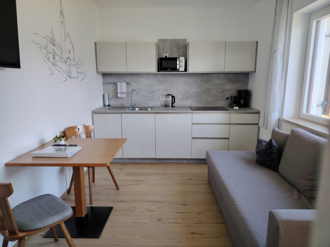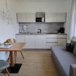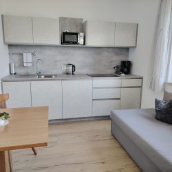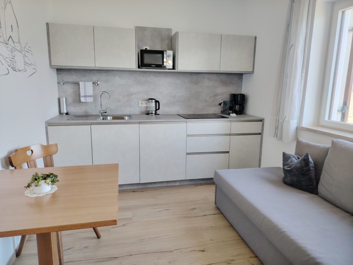 - einen hellen Wohnraum mit voll ausgestatteter Küchenzeile und einem Fernsehsofa,